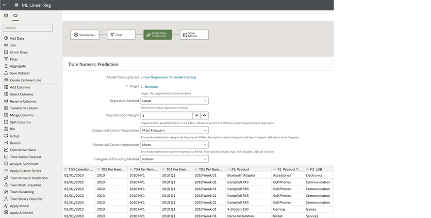 During data preparation, you can use the data flow editor to train numeric prediction, multi-classifier, binary classifier, or clustering models using different built-in algorithms. These ML algorithms can be customized, trained, tuned, and then published to the wider analytics user community. Once models are published, they can be applied to new corporate or personal data sets.