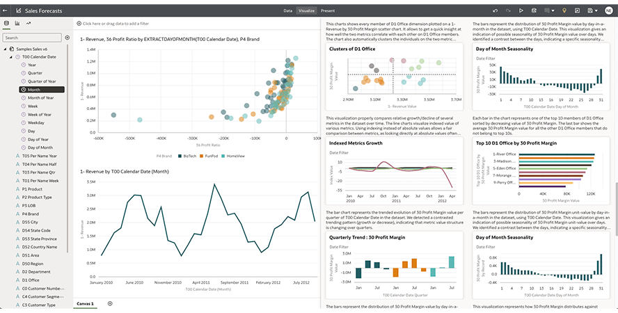 The Auto Insights capability examines data sets and uses ML to automatically create visual insights with all the available metrics and attributes. This can reveal undiscovered connections and patterns in the data that may otherwise not have been considered. With one click, Oracle Analytics will display a range of visualizations with detailed descriptions that you can easily add to your project canvas. All the calculations used to derive the insights are transparent and editable.