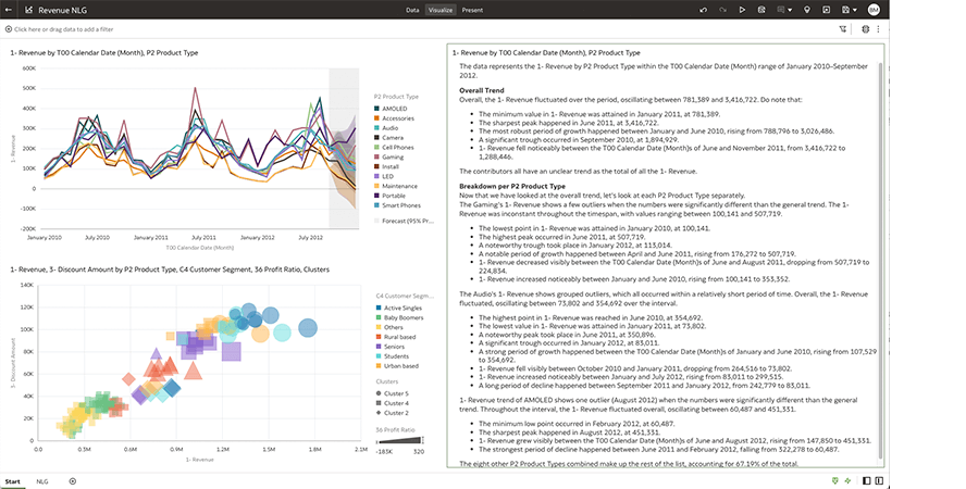 Use AI-powered natural language processing (NLP) and natural language generation (NLG) along with generative AI–created responses to better interact with and understand the analytics. Simply use natural language—spoken or search keywords—to query any information from Oracle Analytics data sets and the semantic layer, without needing to understand where the data resides or the composition of the data set. Automatically render visualizations in context as the query is being built.