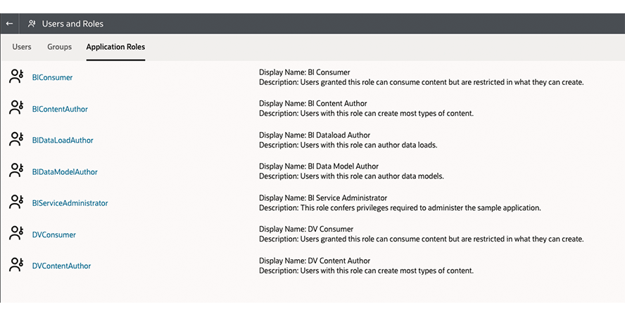 Oracle Analytics provides role-based security. Role-based security can be specified at the user, group, and role level. Use existing roles, such as DV Content Author and BI Service Administrator, or create custom organizational roles.