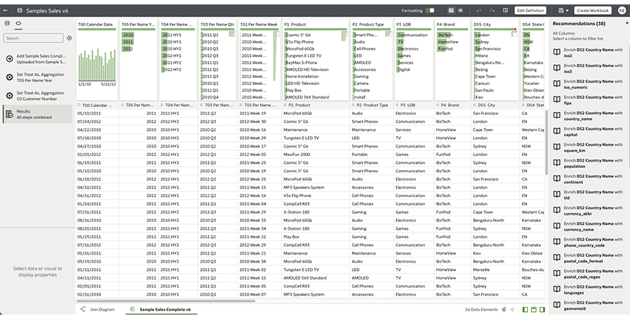 Whether importing data from files or connecting to existing sources, the Quality Insights capability accelerates the preparation of data for analysis. Using the power of the semantic profiler in Oracle Analytics, Quality Insights provides a visual representation of your data's quality, helping to rapidly identify issues. These indicators are based on null values, data type inconsistencies, and semantic type classifications. Each column in your data has a contextual visual to show the distribution of the represented data. Make inline edits to quickly address any issues, rename columns, and use the scrollable mini map to easily traverse long lists.