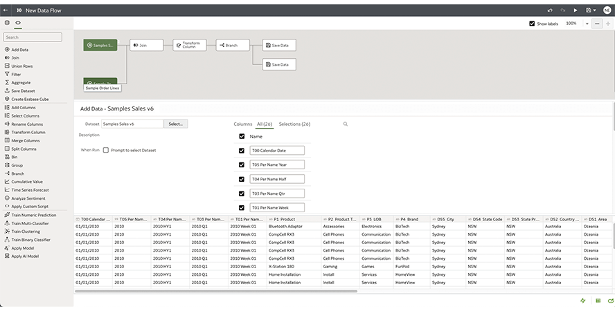 Data flows provide business users with a code-free capability to transform data sets into the information needed for analytics. Connect multiple data sources into cohesive subject areas, whether your sources are in the cloud, on-premises, or personal data extracts. Enrich data through a variety of transformation capabilities, including training and executing machine learning models. Results can be saved in Oracle Analytics storage, a connected RDBMS, or Oracle Essbase. Once built and tested, data flows can be shared with other users or scheduled for regular execution.
