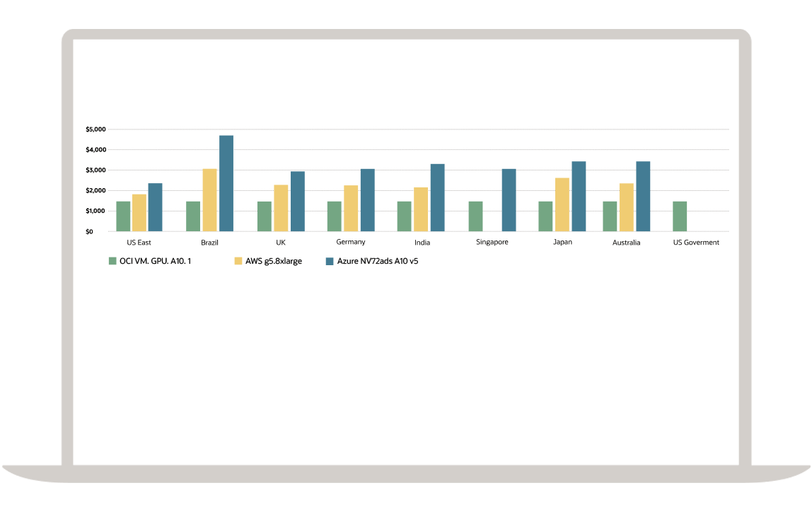 OCI is the only major cloud provider to offer bare metal instances with NVIDIA and AMD GPUs for high performance that’s free of virtualization overhead. For checkpointing during AI training, our instances provide the most local storage per node (61.4 TB with H100 GPUs). For a balance of performance and price, OCI VMs with NVIDIA GPUs are consistently cheaper than AWS and Azure.
