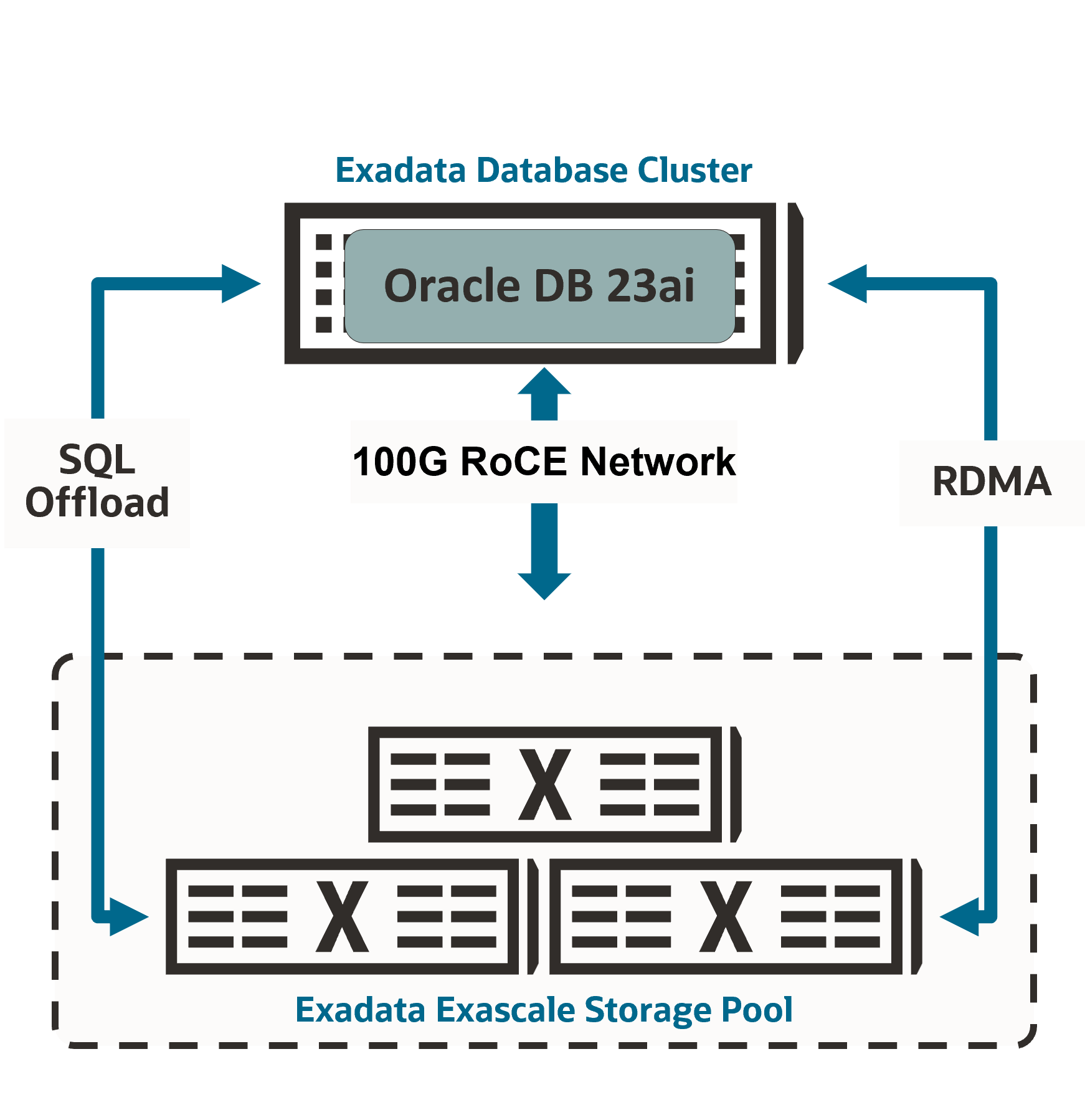 Oracle AI Database 26ai sends intelligent data requests – RDMA for OLTP and Smart Scan for AI and Analytics – directly to pooled Exascale storage servers, taking advantage of Exadata's extremely low microsecond read latency, millions of read IOPS, and extraordinary scan throughput.