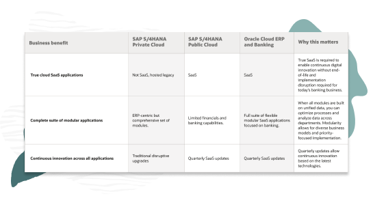 | Complete suite of modular applications | ERP-centric but comprehensive set of modules. | Limited financials and banking capabilities. | Full suite of flexible modular SaaS applications focused on banking. | When all modules are built on unified data, you can optimize processes and analyze data across departments. Modularity allows for diverse business models and priority-focused implementation. |