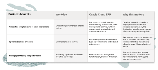 | Access to a complete suite of cloud applications | Limited footprint: financials and HR centric. | Can extend to include inventory, manufacturing, maintenance, order management, logistics, PLM, risk management, supply chain, and customer experience. | Complete support for broad and deep operational, end-to-end processes across finance, HR, distribution, manufacturing, service, sales, marketing, and supply chain, delivered on Industry-leading technology.1 |