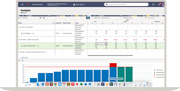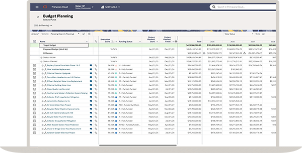 Crea escenarios de diferentes combinaciones de proyectos basados en niveles de riesgo o límites presupuestarios para optimizar la selección de proyectos mientras te mantienes dentro de los objetivos presupuestarios del portafolio para gastos de capital y operativos. La integración nativa con Primavera Unifier puede proporcionar pronósticos actualizados de proyectos y datos reales para facilitar la planificación de capital a varios años.