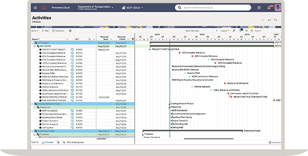 Oracle Primavera Cloud proporciona herramientas de gestión de programas para revisar y actualizar actividades programadas en todos los proyectos de un programa. Los datos financieros y riesgos de los proyectos se pueden resumir a nivel del programa. Usando la función de medidas de agregación, se pueden capturar líneas base y tendencias para obtener visibilidad cruzada de indicadores clave de rendimiento (KPIs).