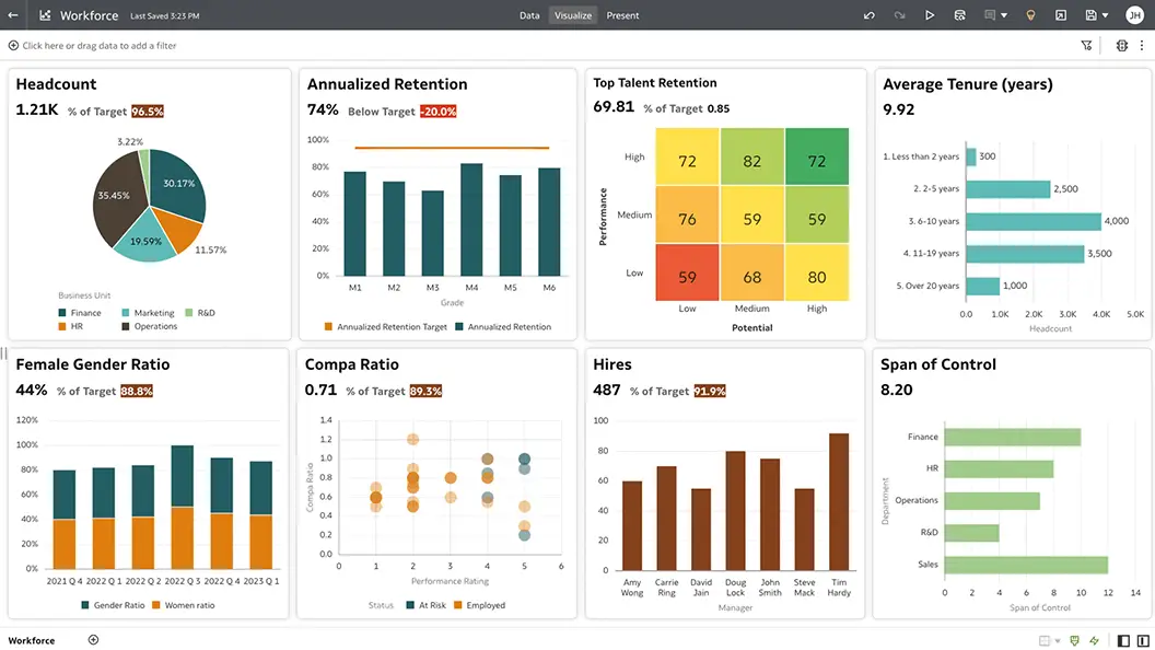Increase visibility across all HR processes, including recruiting, attrition, employee engagement, skills, talent, absence, compensation, and more with best practice prebuilt key performance indicators (KPIs).