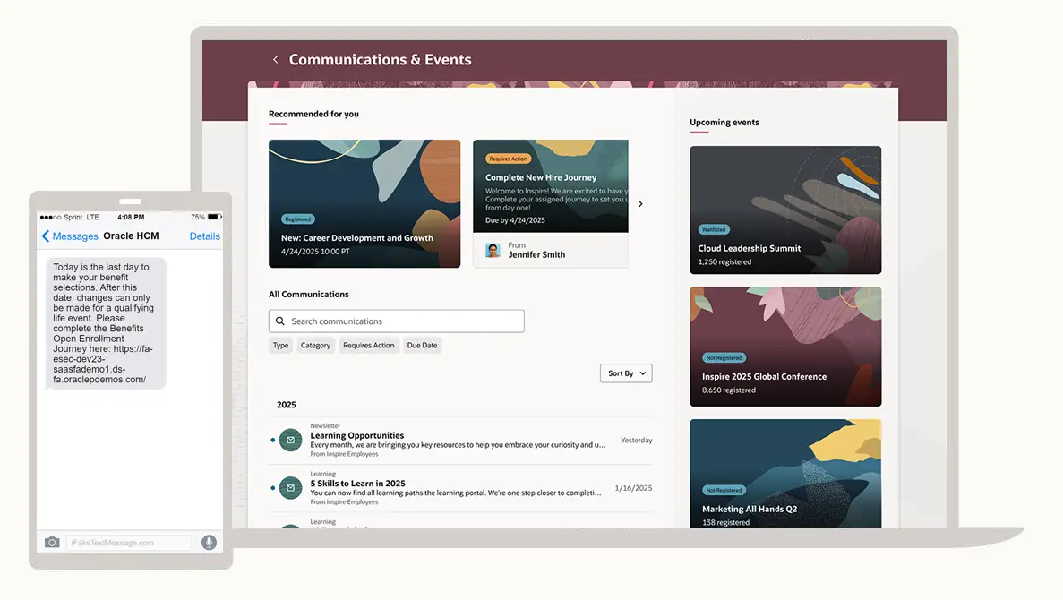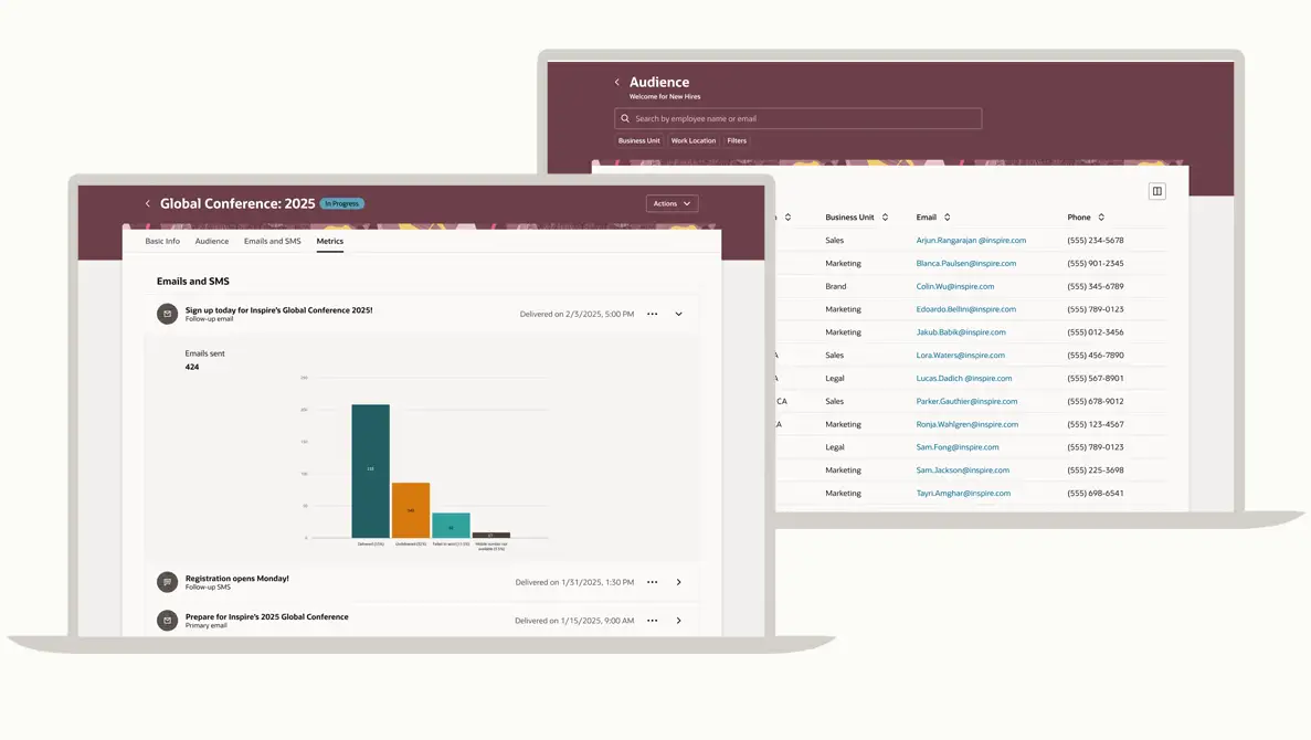 Use a complete HCM cloud solution that’s built directly into Oracle Cloud HCM and natively connects communications and event management with people data and processes to securely reach workers across your organization.