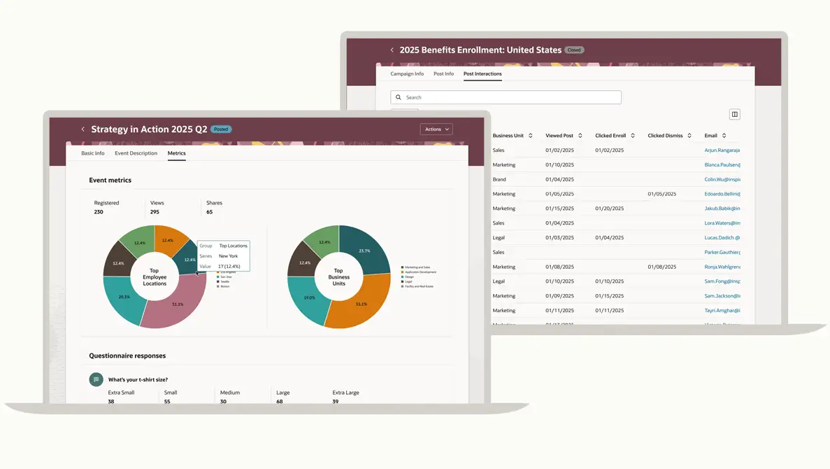 Plan, create, and manage internal events using a unified cloud HCM solution that targets the right audiences using employee data and allows organizers to engage their audiences with communications before and after each event.