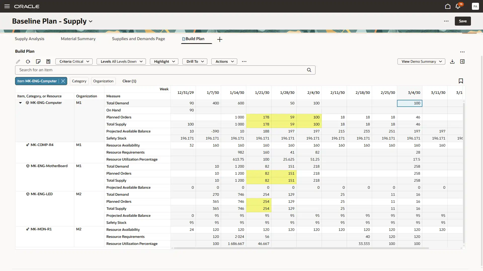 Oracle Supply Planning determines the inventory, capacity, and material supply required to meet demand, including drop shipments, back-to-back orders, and contract-manufactured items. It also highlights exceptions such as demand compression, material shortages, and resource overloads that can put demand at risk. As you choose from proposed expediting actions, capacity increases, and other interventions, you can see their financial and customer service impact.