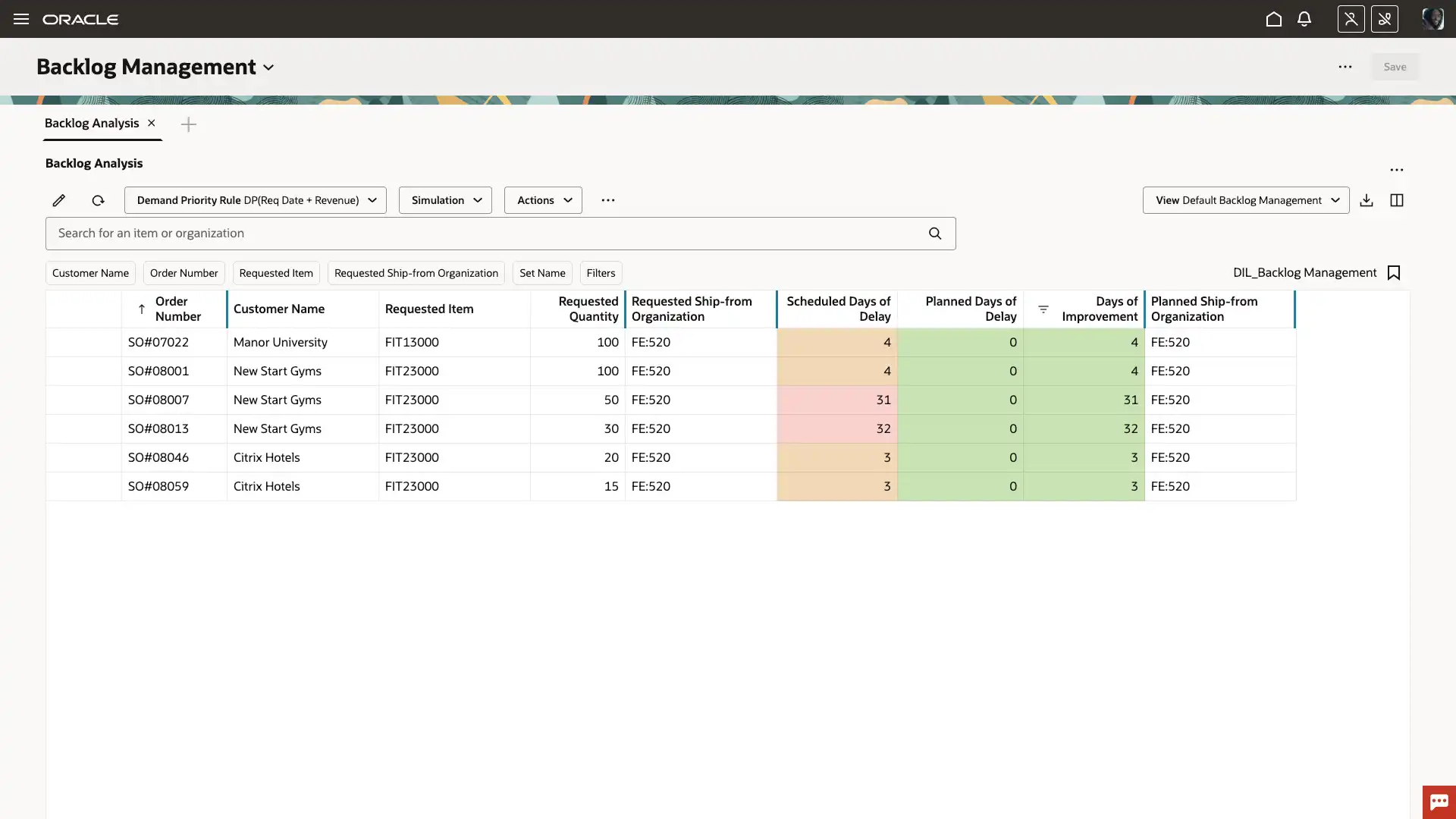 Oracle Supply Planning's backlog management features help you prioritize and reschedule your open sales orders when items are on allocation or supply availability changes. Simulate alternate scenarios and change sourcing, expedite transportation, or split lines to reduce delivery delays, increase sales, or preserve margins.