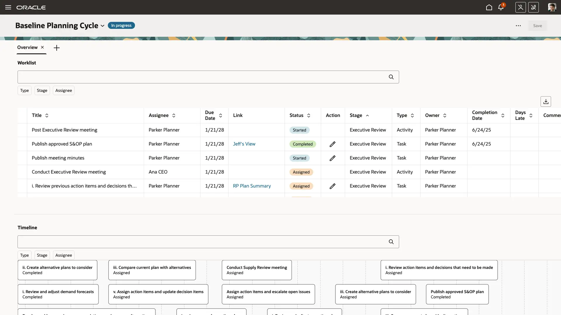 Key stakeholders must contribute, collaborate, and come to consensus on goal-congruent, connected product, financial, sales, marketing, supply chain, and workforce plans. Best-practice planning stages and workflows guide users through tasks, allowing them to track milestones and overall progress.