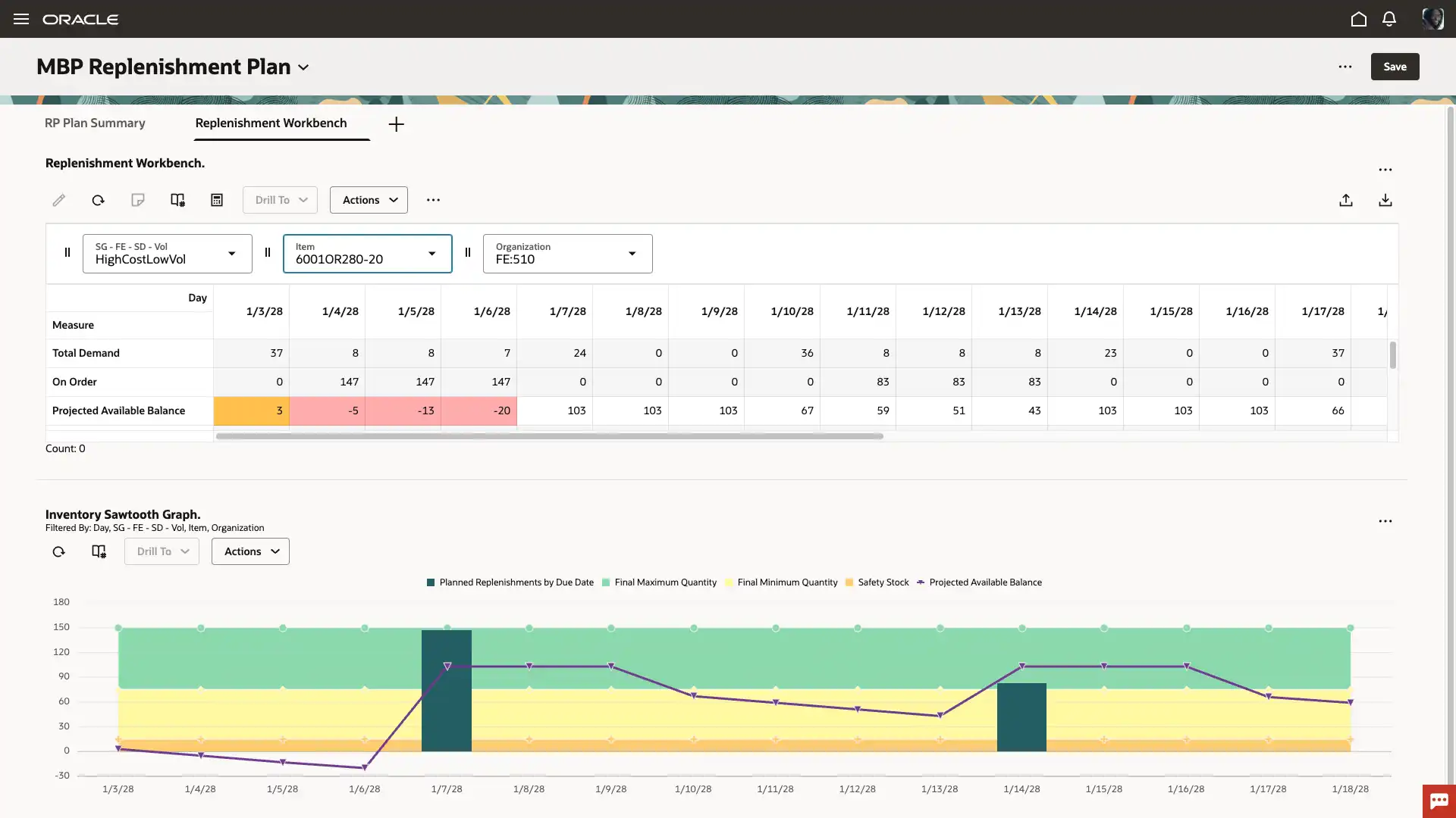 Oracle Demand Management can automate demand-driven, time-phased replenishment processes across a multi-echelon network of stores, depots, and other regularly stocked locations. It also replenishes periodic automated replenishment (PAR) locations in clinical settings. You can quickly resolve stockouts and other inventory exceptions interactively through graphical simulation. You can also consolidate purchases to achieve price breaks and reduce logistics costs.