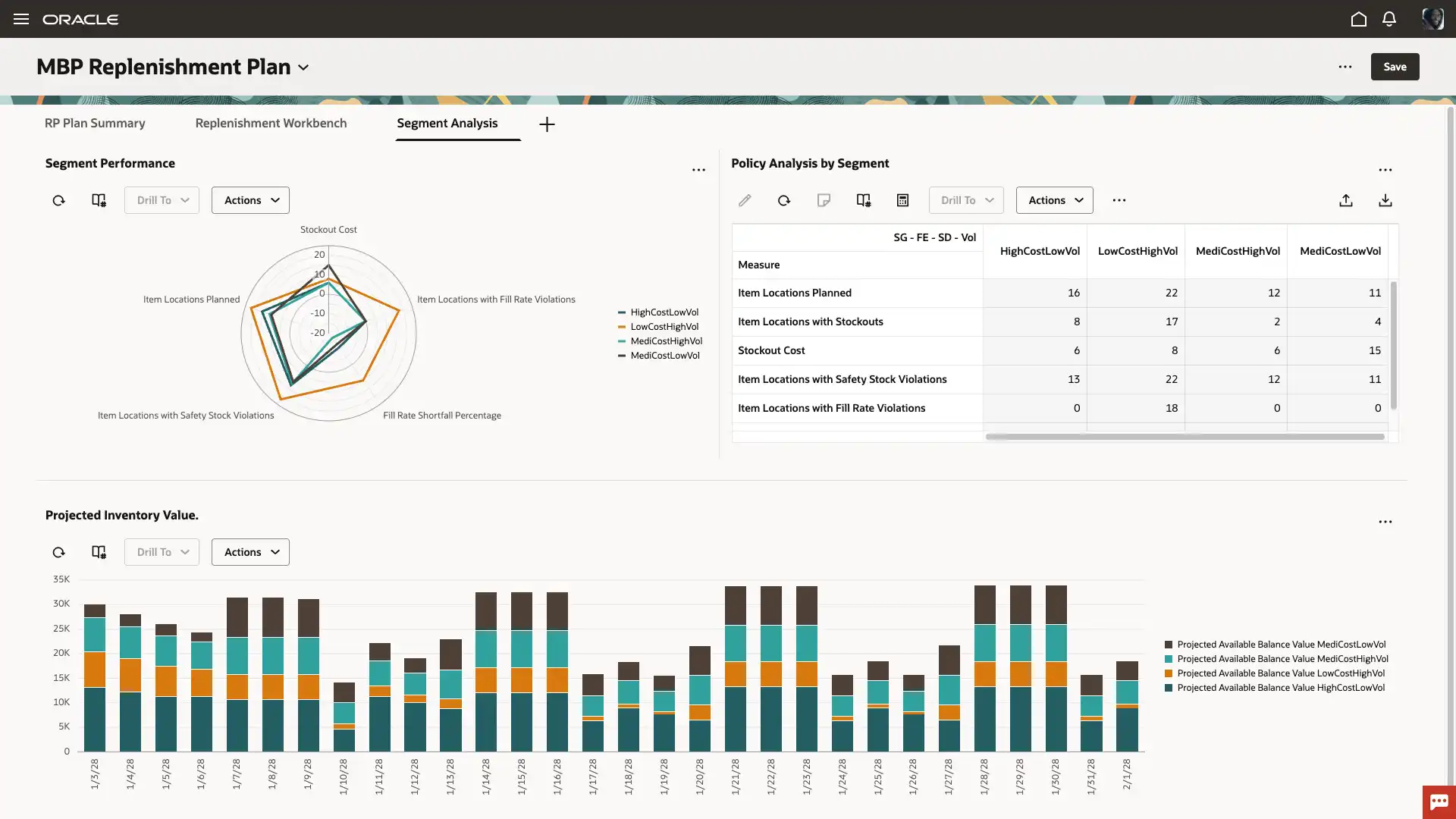 Demand patterns and inventory objectives can vary widely among replenishment locations. Using Oracle's replenishment planning features, you can divide your business into dynamic, rule-based segments with independent policies. Flexible segment criteria can include cost, volume, volatility, and many other attributes.