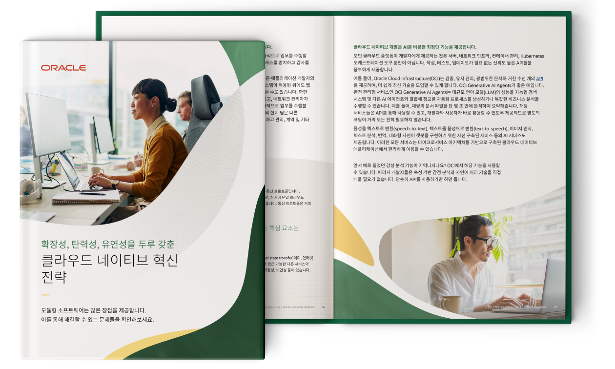 Oracle이 제시하는 해결책은 클라우드의 민첩성과 회복탄력성을 활용할 수 있도록 특별히 제작된 클라우드 네이티브 애플리케이션입니다. 귀사의 시스템은 클라우드 네이티브 아키텍처를 통해 수요를 충족하고, 업데이트를 신속하게 구현하고, 탁월한 안전성 및 성능을 제공할 수 있습니다.