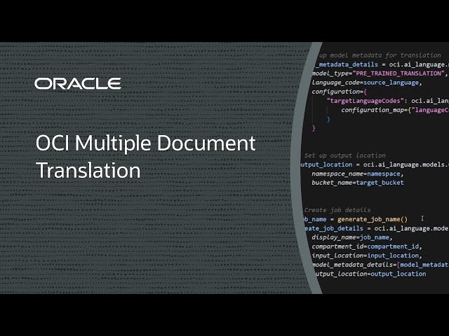Esta solución está diseñada para automatizar la traducción de varios documentos almacenados en un cubo de Oracle Cloud Infrastructure (OCI) Object Storage. Por ejemplo, imagine una empresa que colabora en un proyecto de código abierto con colaboradores de todo el mundo. Con esta solución, la documentación y las instrucciones se pueden traducir a varios idiomas, lo que permite a los desarrolladores de todo el mundo contribuir sin problemas.