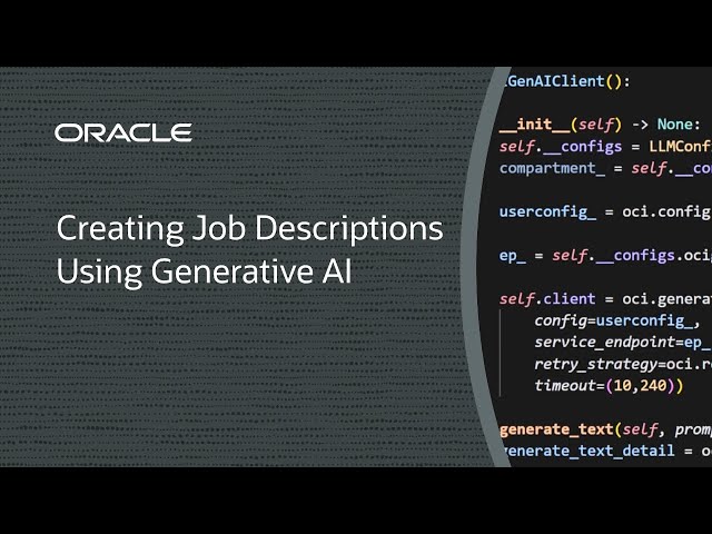 Como reclutador o mánager de contratación, puede usar la IA generativa para obtener ayuda para crear el primer borrador de una descripción de puesto en función del cargo, la empresa y la división. El borrador podría incluir un resumen, una descripción, responsabilidades y calificaciones. Esta es una aplicación de demostración en la que se muestra cómo puede utilizar el servicio Oracle Cloud Infrastructure (OCI) Generative AI para crear rápidamente una aplicación en funcionamiento.