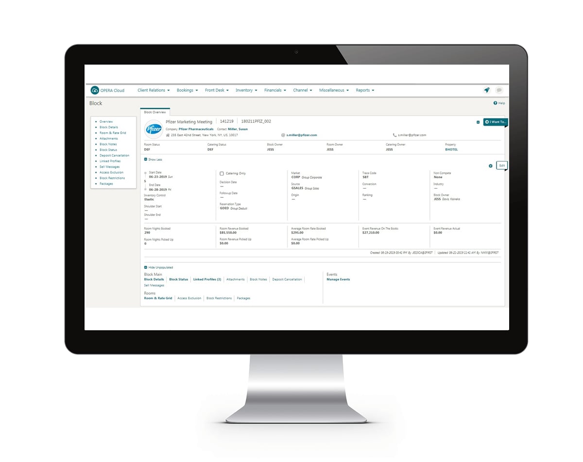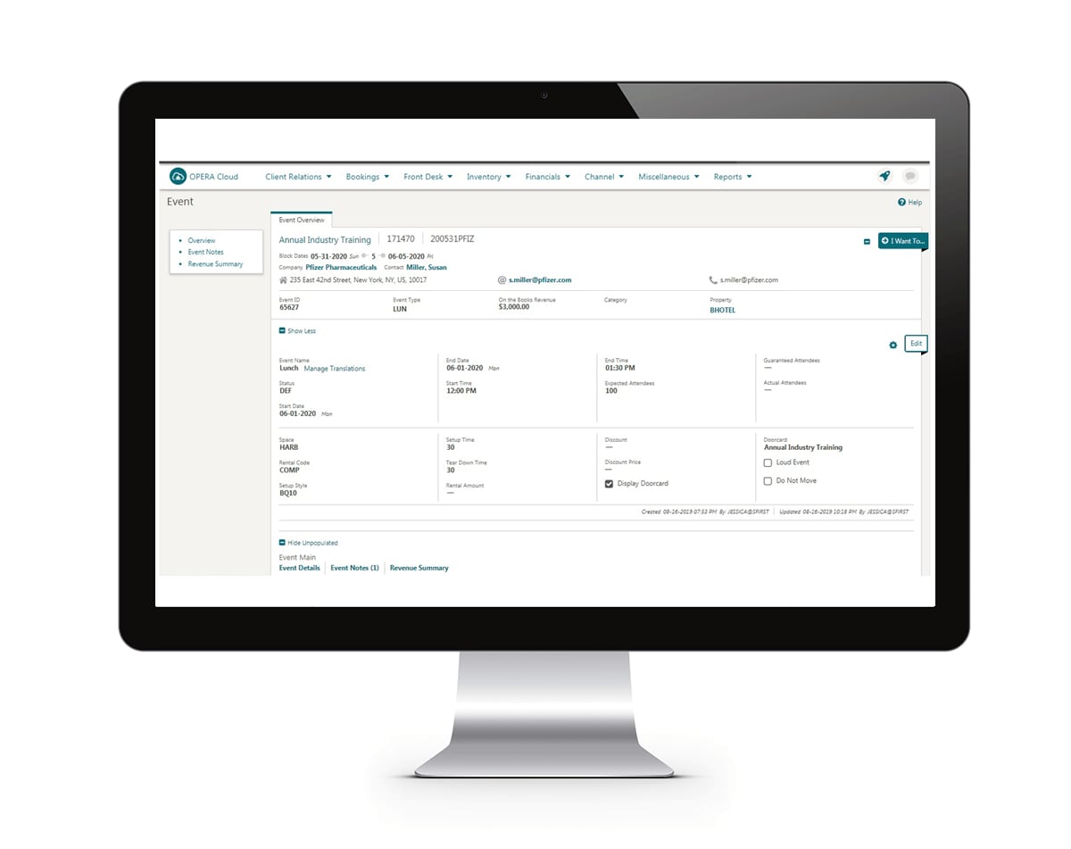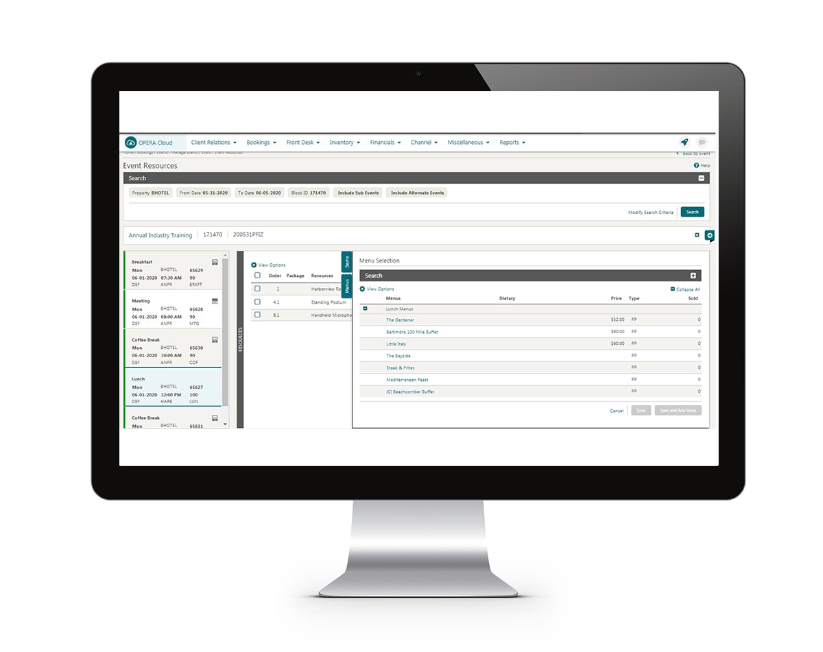 OPERA Sales and Event Management ofrece disponibilidad en tiempo real a las habitaciones y los espacios funcionales. Cuando se combina con la aplicación basada en la nube OPERA Cloud Property Management, proporciona una experiencia optimizada para ayudarlo a reservar de manera rápida y eficiente, lo que le brinda más tiempo para llevar a cabo sus actividades comerciales diarias.