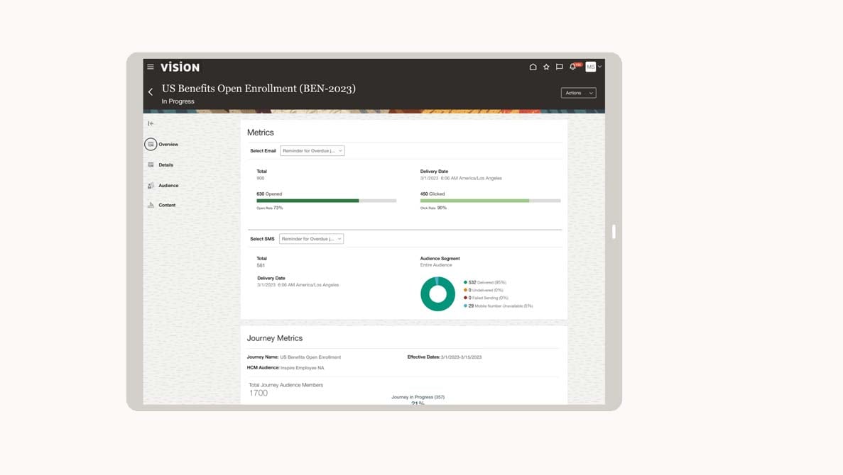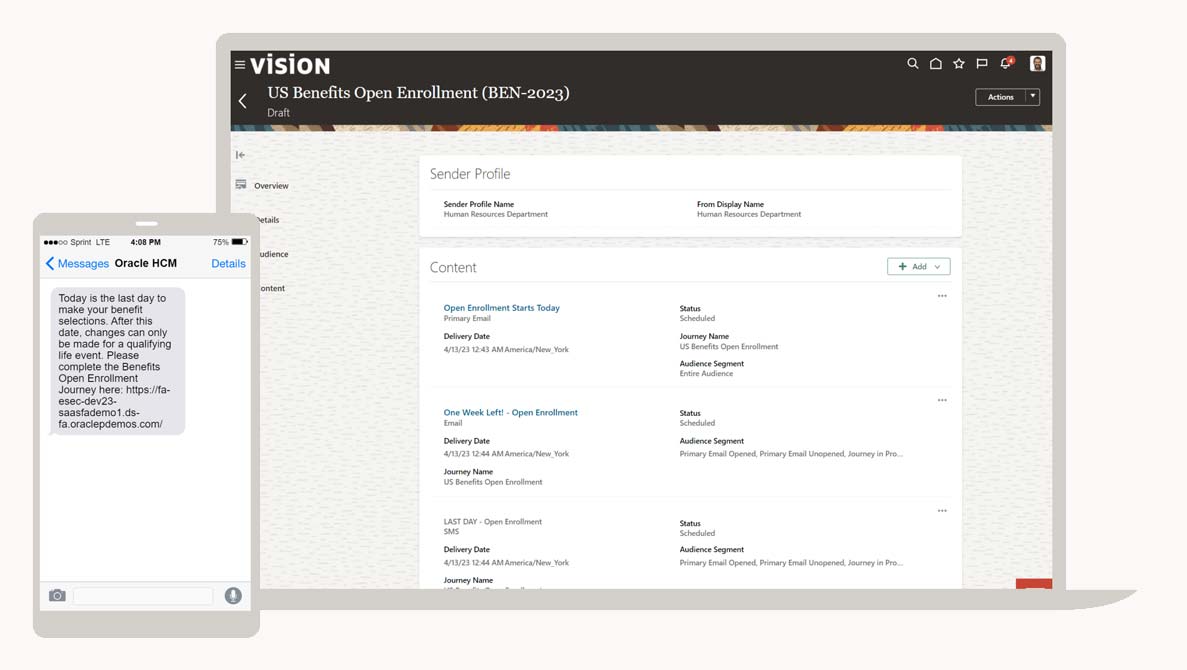 استخدم حلاً سحابيًا كاملاً من HCM مُضمنًا مباشرةً في Oracle Cloud HCM ويربط في الأصل الاتصالات وإدارة الأحداث ببيانات الأشخاص والعمليات للوصول بأمان إلى العمال عبر مؤسستك.