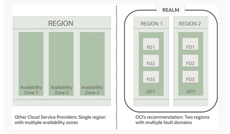 Oracle Cloud Infrastructure jest hostowana w regionach zlokalizowanych w różnych miastach na całym świecie, co zapewnia geograficzną separację. Regiony działają na odrębnych sieciach energetycznych, infrastrukturze sieciowej i geograficznych obszarach klęsk żywiołowych, takich jak tereny zalewowe. W celu wyeliminowania typowych awarii komponentów wszystkie regiony zostały zaprojektowane z myślą o zapewnieniu wysokiej dostępności architektur dla aplikacji i baz danych korzystających z domen awaryjnych (FD).