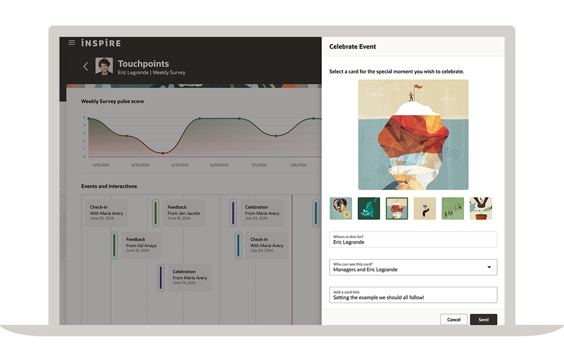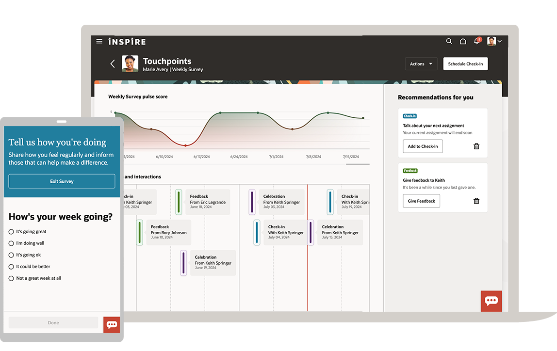 Oracle Touchpoints wykorzystuje dane z ujednoliconego pakietu HCM, aby zapewnić menedżerom spersonalizowane informacje o zespole, zalecane działania i możliwości ciągłego zaangażowania, dzięki czemu mogą umożliwić swoim pracownikom uzyskiwanie jak najlepszych wyników każdego dnia.