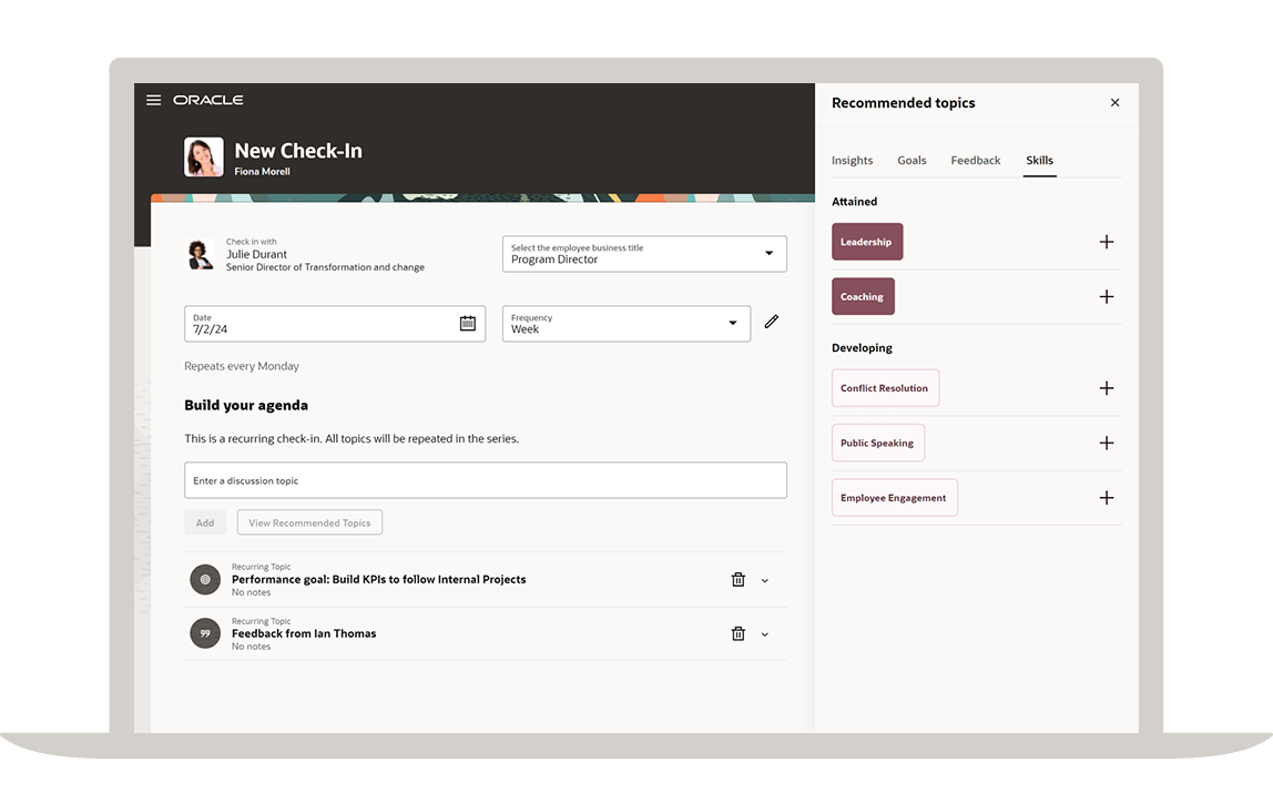 Dodawaj do spotkań kontrolnych zalecane tematy dyskusji, które są dynamicznie aktualizowane w oparciu o interakcje w całym pakiecie HCM — w tym m.in. umiejętności, cele i informacje zwrotne.