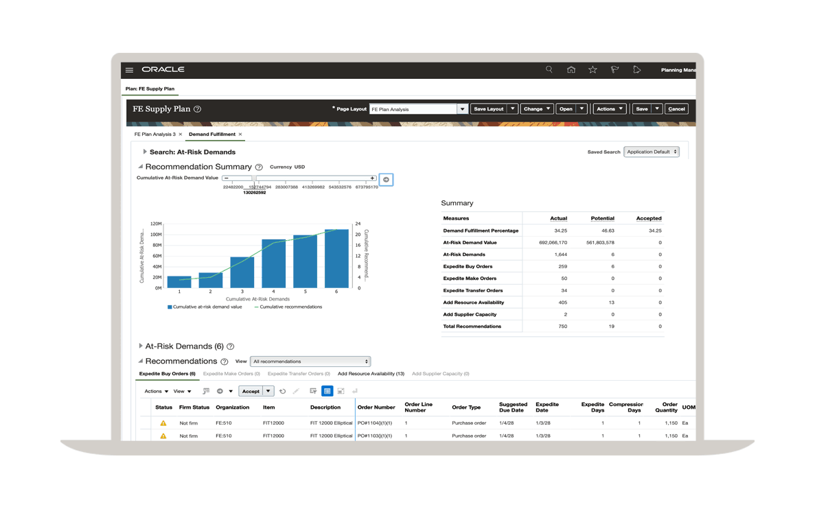 Oracle Supply Planning 能確定滿足需求所需的庫存、產能和物料供應,包括直接出貨、接單採購和合約製造項目。該解決方案還能標明可能導致需求面臨風險的需求壓縮、材料短缺和資源超載等異常情況。在選擇加速措施、擴增產能或其他干預措施時,您可以看到這些措施對財務和客戶服務的潛在影響。
