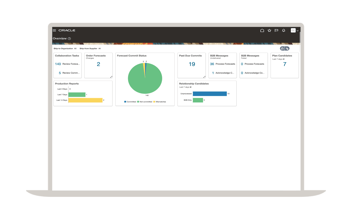 在當今全球化的供應鏈中,確保客戶、合約製造商和供應商對計畫保持同步至關重要。Oracle Supply Chain Collaboration 提供對下游需求和上游供應承諾的視圖,並提醒您任何不匹配的情況。在預警的協助下,您可以跨越多個供應鏈層級進行協作,確保端對端的協調一致。