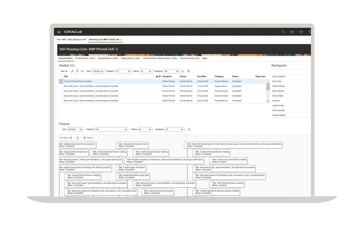 關鍵利害關係人必須保持聯繫,為目標一致的產品、財務、銷售、行銷、供應鏈和人力計畫做出貢獻、攜手合作並達成共識。規劃階段最佳實務與工作流程可指引使用者完成任務、追蹤里程碑和整體進度。